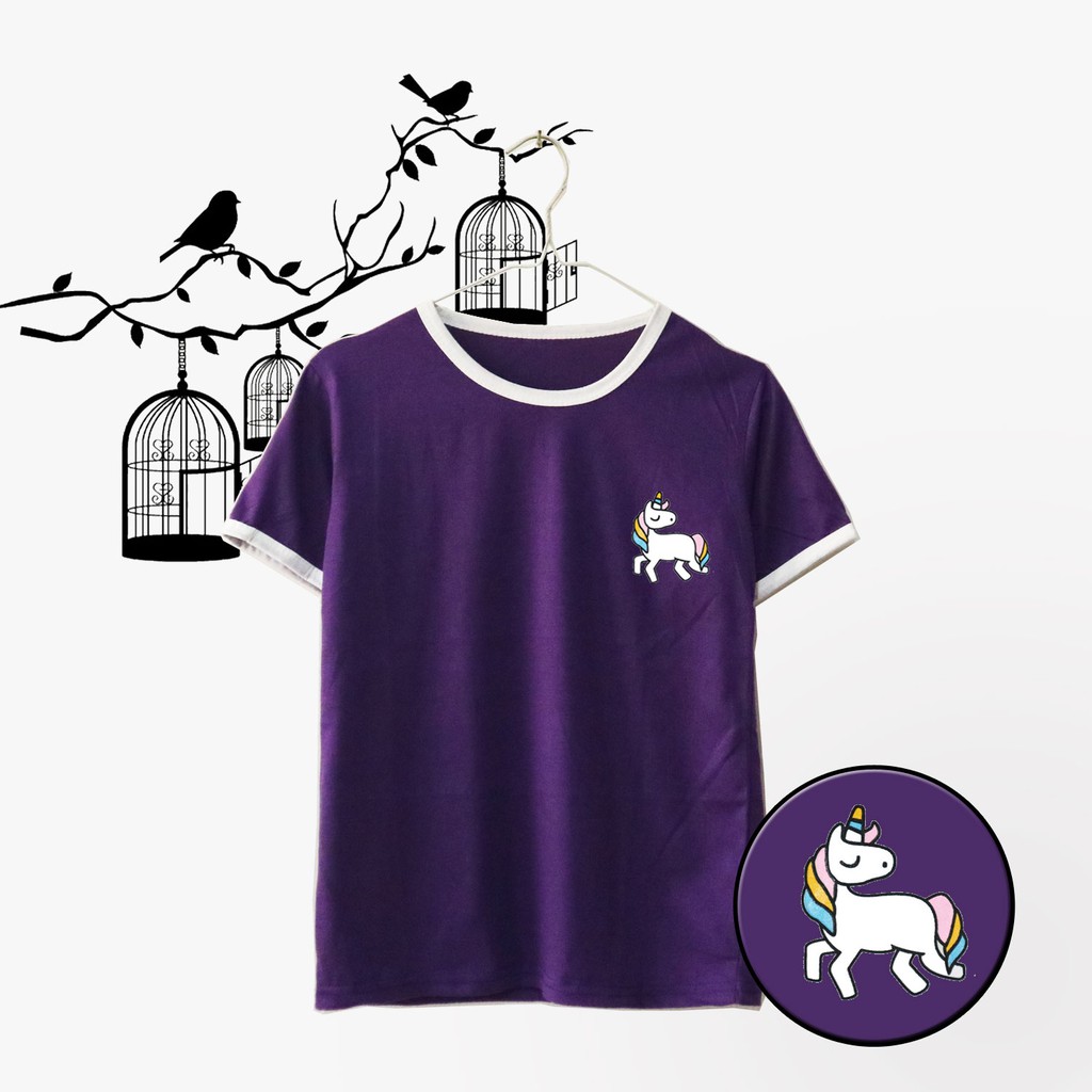 Ringer Tee Wanita Lengan Pendek Flying Unicorn Warna Ungu