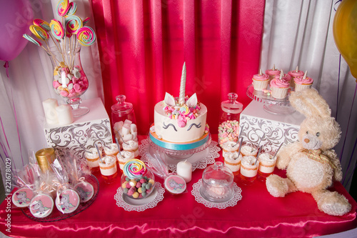 Sweet Table And Big Unicorn Cake For Baby Girl First Birthday