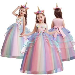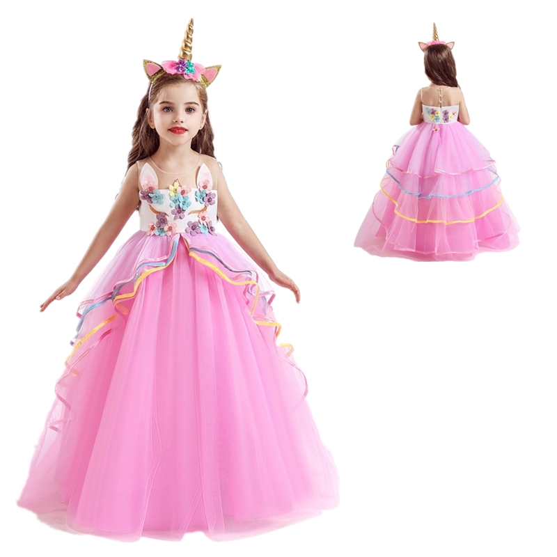 Princess Pink Girl Dress Flower Unicorn Party Long Gown Wedding