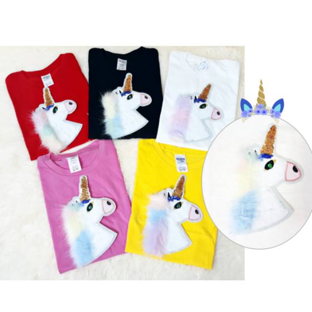 Baju Kaos Anak Cewek Perempuan Bulu Halus Sequin Unicorn Furry Red