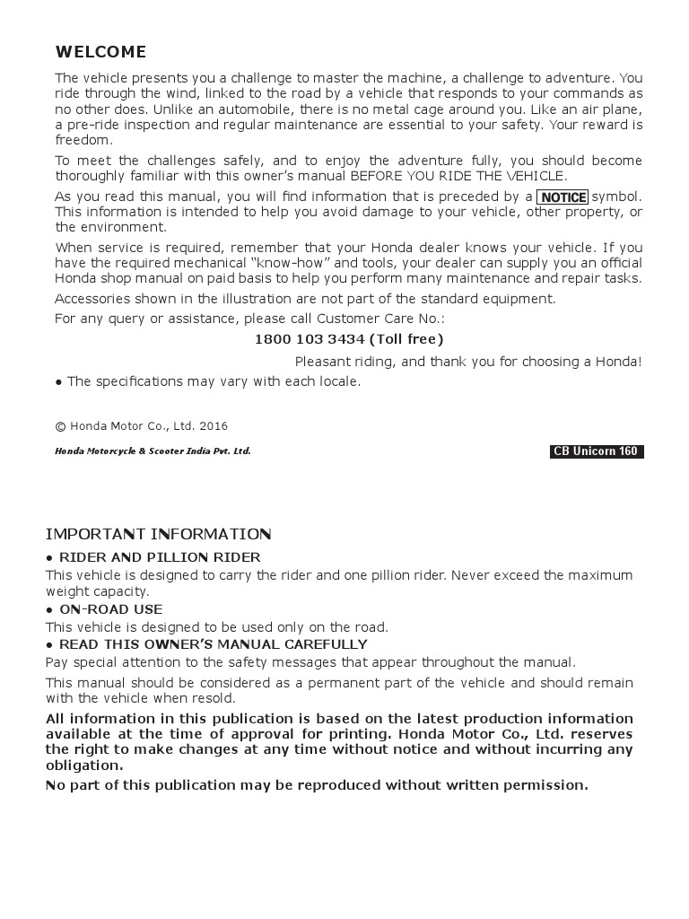 Owners Manual Cb Unicorn 160 English Tire Gasoline