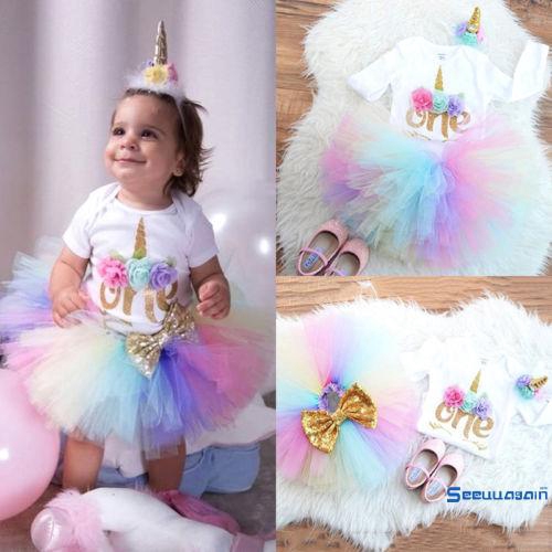 See3pcs Baby Girl 1st Birthday Outfit Party Unicorn Romper